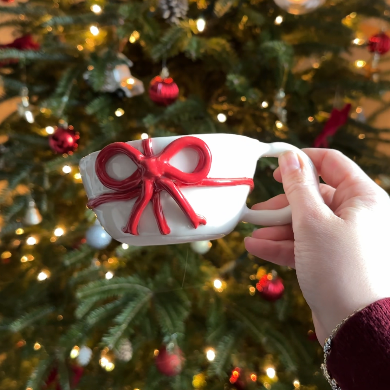 Comme un petit cadeau juste pour toi 🎁 ! Cette tasse rouge avec son joli nœud apporte une touche de fête et de joie à ton quotidien. Parfaite pour offrir ou pour t’offrir un moment de douceur.